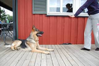 Lydighet har vi da altså alt begynt med.. Da vi fikk en schæfer i huset fant vi ut at vi skulle ta han med på valpekurs og unghundkurs, men på unghundkurset måtte vi gi opp. Vi fikk beskjed av instruktørern vår om å prøve å kastrere, siden han hadde bare èn sten nede. Han var stressa, ufokusert og bjeffet på alt han så/hørte (eller trodde han så og hørte). Vi dro opp til Røros hvor onkel kastrerte ham. Det ble ikke bedre, dessverre. Vi flyttet så på småbruk midt i skogen uten forstyrrelser, hvor jeg vil påstå at han kanskje har begynt å roe seg litt. Vi ber folk som kommer på besøk om å totalt overse han, gjespe, snu ryggen til og "riste seg". Dette har gradvis hjulpet, men utenom hjemme er han umulig å få kontakt med. Vi har også prøvd klikkertrening, halsbånd med lyd (pga bjeffing), halsbånd med sprut (pga bjeffing) men uten hell.. Spruten syntes han var drit gøy, og lyden brø han seg ikke om. Han er alt for "høyt oppe". Tar jeg meg god tid med han alene ute i hagen med pølser som forsterker får jeg øyekontakt og gamle kunster fra valpekurset kommer fram.. Så han er nok ikke en helt lost case, men må kanskje bare bli litt eldre og roe seg litt.. Det er bare så vanskelig å få han til å roe seg når han er helt i 100 hele tiden! Roser han mye når han slapper av også og håper det skal hjelpe!